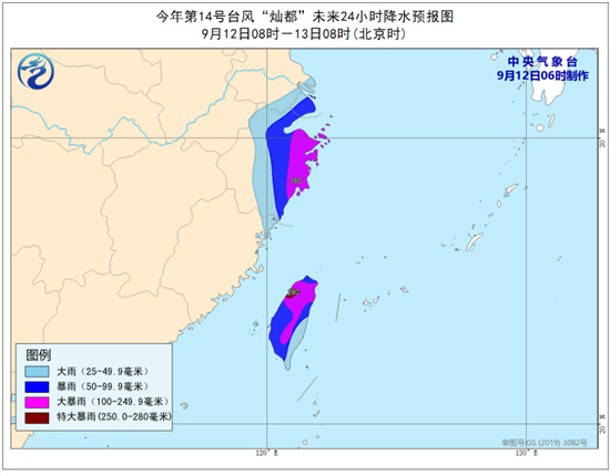 降水预报:12日08时至13日08时,浙江北部和中东部、上海、江苏东南部、福建东北部、台湾岛等地的部分地区有大到暴雨,其中,浙江东部局地有大暴雨(100-160毫米),台湾岛局地有大暴雨或特大暴雨(250-280毫米)。