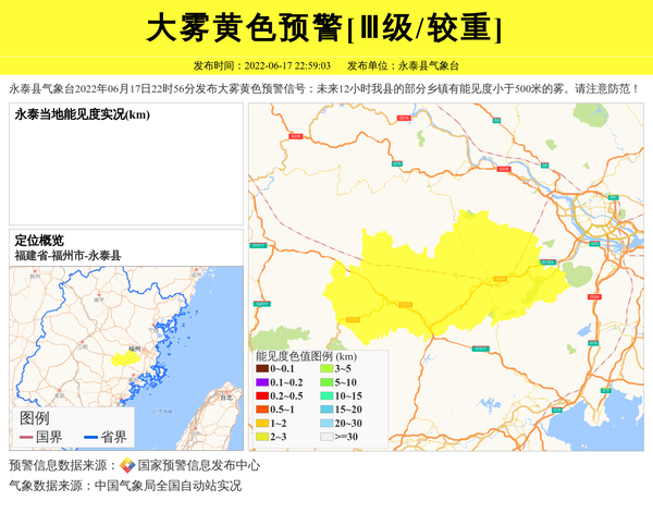 永泰县气象台2022年06月17日22时56分发布大雾黄色预警信号:未来12小时我县的部分乡镇有能见度小于500米的雾。请注意防范! 信息来源:国家预警信息发布中心; 发布单位:永泰县气象台。