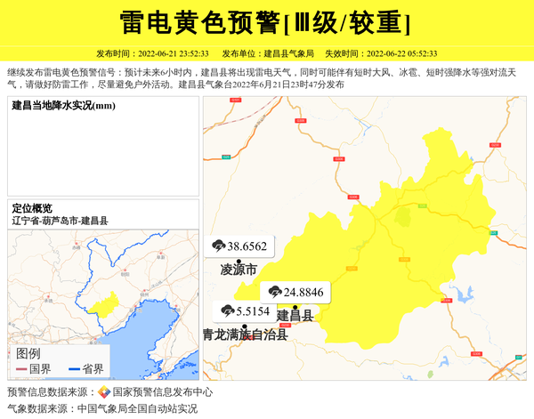 继续发布雷电黄色预警信号:预计未来6小时内,建昌县将出现雷电天气,同时可能伴有短时大风、冰雹、短时强降水等强对流天气,请做好防雷工作,尽量避免户外活动。建昌县气象台2022年6月21日23时47分发布 信息来源:国家预警信息发布中心; 发布单位:建昌县气象局。