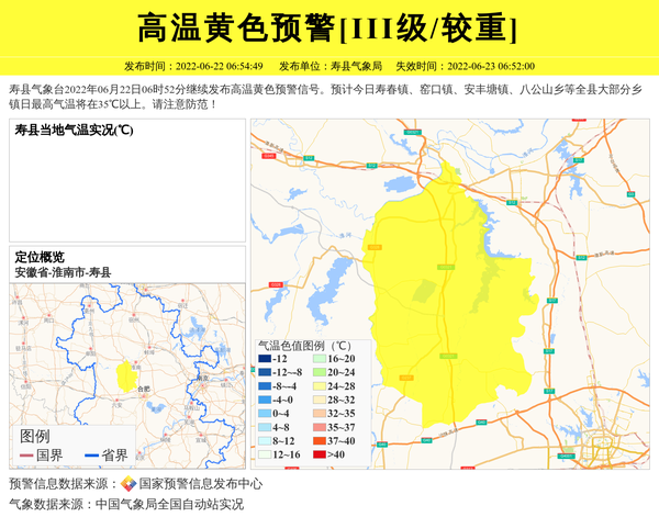 寿县气象台2022年06月22日06时52分继续发布高温黄色预警信号。预计今日寿春镇、窑口镇、安丰塘镇、八公山乡等全县大部分乡镇日最高气温将在35℃以上。请注意防范! 信息来源:国家预警信息发布中心; 发布单位:寿县气象局。