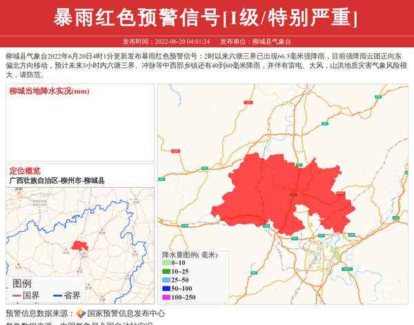 柳城县气象台2022年6月20日4时1分更新发布暴雨红色预警信号:2时以来六塘三界已出现66.3毫米强降雨,目前强降雨云团正向东偏北方向移动,预计未来3小时内六塘三界、冲脉等中西部乡镇还有40到60毫米降雨,并伴有雷电、大风,山洪地质灾害气象风险很大,请防范。 信息来源:国家预警信息发布中心; 发布单位:柳城县气象台。