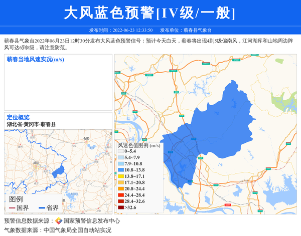 蕲春县气象台2022年06月23日12时30分发布大风蓝色预警信号:预计今天白天,蕲春将出现4到5级偏南风,江河湖库和山地周边阵风可达6到8级,请注意防范。 信息来源:国家预警信息发布中心; 发布单位:蕲春县气象台。