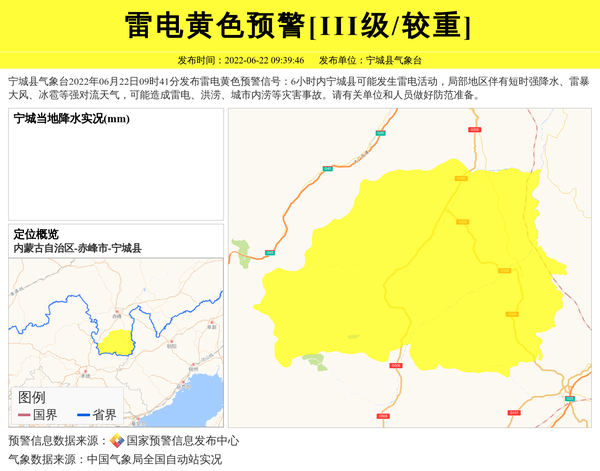宁城县气象台2022年06月22日09时41分发布雷电黄色预警信号:6小时内宁城县可能发生雷电活动,局部地区伴有短时强降水、雷暴大风、冰雹等强对流天气,可能造成雷电、洪涝、城市内涝等灾害事故。请有关单位和人员做好防范准备。 信息来源:国家预警信息发布中心; 发布单位:宁城县气象台。
