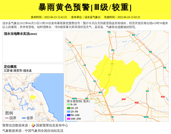 涟水县气象台2022年06月23日12时39分发布暴雨黄色预警信号:预计今天白天到夜里我县所有镇街,经济开发区将出现6小时50毫米以上的暴雨,并伴有雷电、短时强降水、7到9级雷暴大风等强对流天气,县应急、气象联合提醒做好防范。 信息来源:国家预警信息发布中心; 发布单位:涟水县气象台。