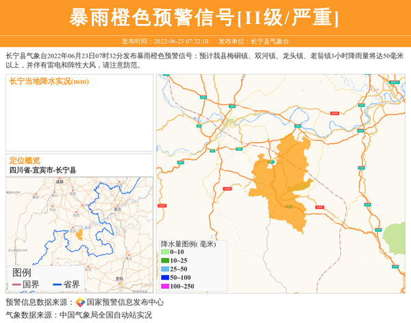 长宁县气象台2022年06月23日07时32分发布暴雨橙色预警信号:预计我县梅硐镇、双河镇、龙头镇、老翁镇3小时降雨量将达50毫米以上,并伴有雷电和阵性大风,请注意防范。 信息来源:国家预警信息发布中心; 发布单位:长宁县气象台。