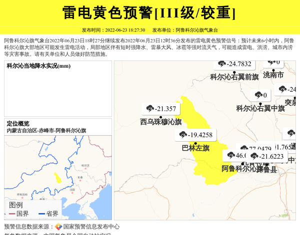 阿鲁科尔沁旗气象台2022年06月23日18时27分继续发布2022年06月23日12时36分发布的雷电黄色预警信号:预计未来6小时内,阿鲁科尔沁旗大部地区可能发生雷电活动,局部地区伴有短时强降水、雷暴大风、冰雹等强对流天气,可能造成雷电、洪涝、城市内涝等灾害事故。请有关单位和人员做好防范措施。 信息来源:国家预警信息发布中心; 发布单位:阿鲁科尔沁旗气象台。