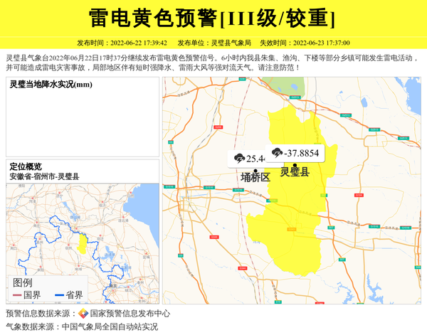 灵璧县气象台2022年06月22日17时37分继续发布雷电黄色预警信号。6小时内我县朱集、渔沟、下楼等部分乡镇可能发生雷电活动,并可能造成雷电灾害事故,局部地区伴有短时强降水、雷雨大风等强对流天气。请注意防范! 信息来源:国家预警信息发布中心; 发布单位:灵璧县气象局。