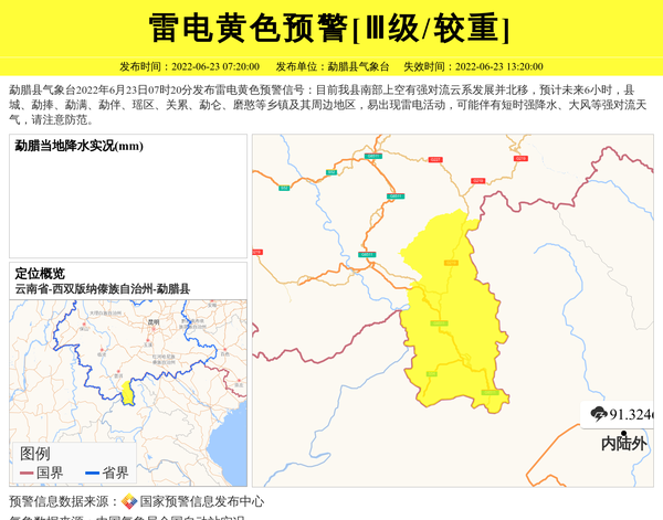勐腊县气象台2022年6月23日07时20分发布雷电黄色预警信号:目前我县南部上空有强对流云系发展并北移,预计未来6小时,县城、勐捧、勐满、勐伴、瑶区、关累、勐仑、磨憨等乡镇及其周边地区,易出现雷电活动,可能伴有短时强降水、大风等强对流天气,请注意防范。 信息来源:国家预警信息发布中心; 发布单位:勐腊县气象台。