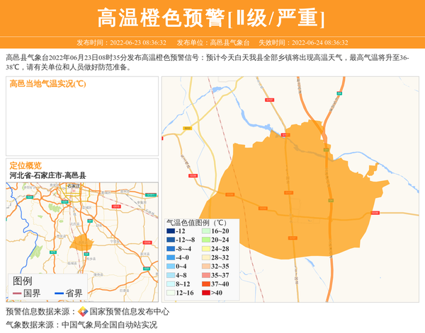 高邑县气象台2022年06月23日08时35分发布高温橙色预警信号:预计今天白天我县全部乡镇将出现高温天气,最高气温将升至36-38℃,请有关单位和人员做好防范准备。 信息来源:国家预警信息发布中心; 发布单位:高邑县气象台。