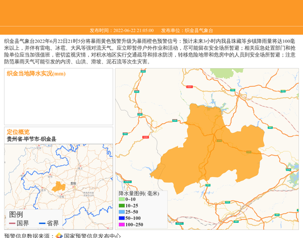 织金县气象台2022年6月22日21时5分将暴雨黄色预警升级为暴雨橙色预警信号:预计未来3小时内我县珠藏等乡镇降雨量将达100毫米以上,并伴有雷电、冰雹、大风等强对流天气。应立即暂停户外作业和活动,尽可能留在安全场所暂避;相关应急处置部门和抢险单位应当加强值班,密切监视灾情,对积水地区实行交通疏导和排水防涝,转移危险地带和危房中的人员到安全场所暂避;注意防范暴雨天气可能引发的内涝、山洪、滑坡、泥石流等次生灾害。 信息来源:国家预警信息发布中心; 发布单位:织金县气象台。