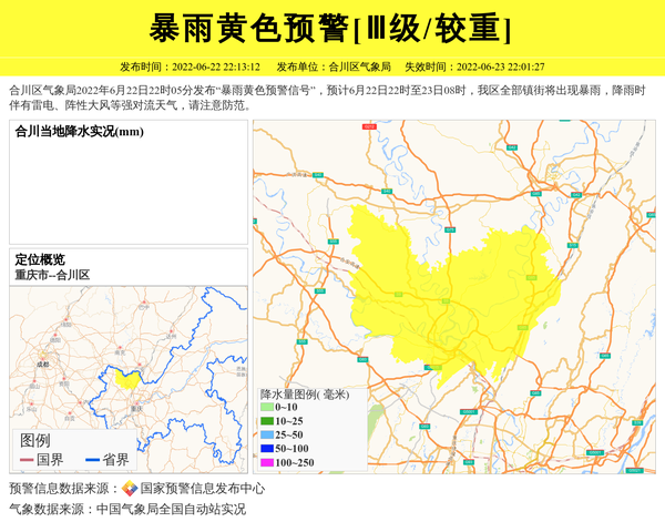 合川区气象局2022年6月22日22时05分发布“暴雨黄色预警信号”,预计6月22日22时至23日08时,我区全部镇街将出现暴雨,降雨时伴有雷电、阵性大风等强对流天气,请注意防范。 信息来源:国家预警信息发布中心; 发布单位:合川区气象局。