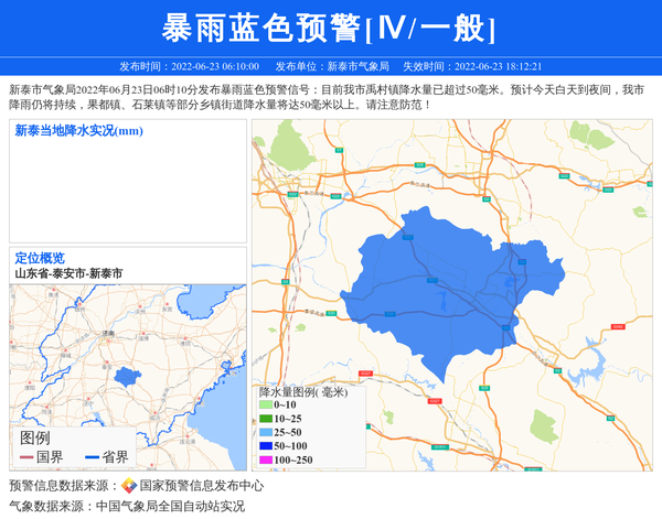 新泰市气象局2022年06月23日06时10分发布暴雨蓝色预警信号:目前我市禹村镇降水量已超过50毫米。预计今天白天到夜间,我市降雨仍将持续,果都镇、石莱镇等部分乡镇街道降水量将达50毫米以上。请注意防范! 信息来源:国家预警信息发布中心; 发布单位:新泰市气象局。