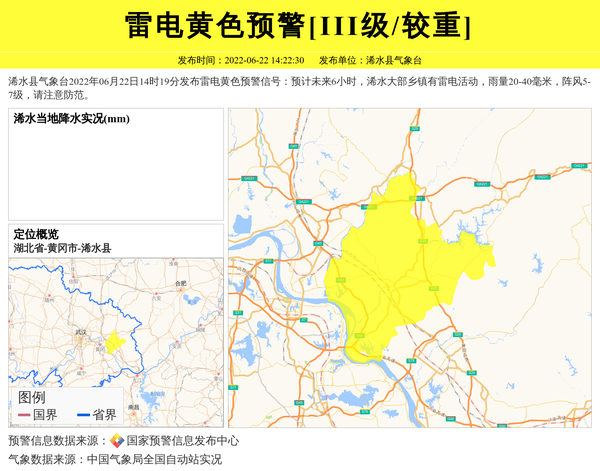 浠水县气象台2022年06月22日14时19分发布雷电黄色预警信号:预计未来6小时,浠水大部乡镇有雷电活动,雨量20-40毫米,阵风5-7级,请注意防范。 信息来源:国家预警信息发布中心; 发布单位:浠水县气象台。