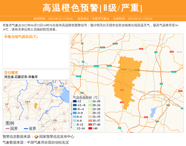辛集市气象台2022年06月22日16时58分发布高温橙色预警信号:预计明天白天我市全部乡镇将出现高温天气,最高气温将升至36-38℃,请有关单位和人员做好防范准备。 信息来源:国家预警信息发布中心; 发布单位:辛集市气象台。