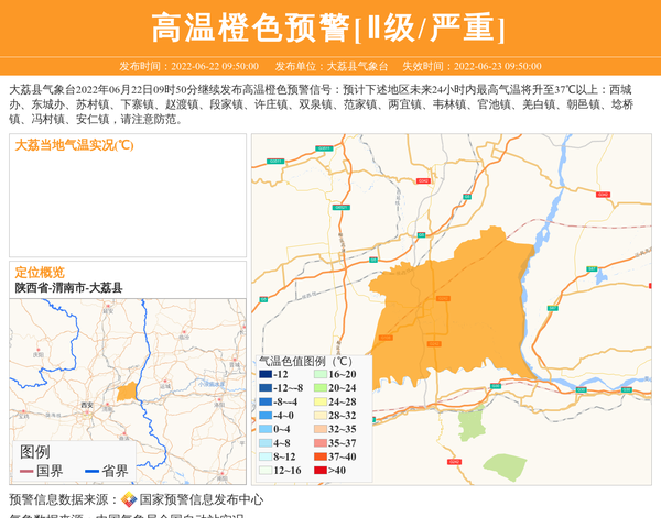 大荔县气象台2022年06月22日09时50分继续发布高温橙色预警信号:预计下述地区未来24小时内最高气温将升至37℃以上:西城办、东城办、苏村镇、下寨镇、赵渡镇、段家镇、许庄镇、双泉镇、范家镇、两宜镇、韦林镇、官池镇、羌白镇、朝邑镇、埝桥镇、冯村镇、安仁镇,请注意防范。 信息来源:国家预警信息发布中心; 发布单位:大荔县气象台。