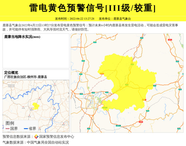 鹿寨县气象台2022年6月22日13时27分发布雷电黄色预警信号:预计未来6小时内鹿寨县将发生雷电活动,可能会造成雷电灾害事故,并可能伴有短时强降雨、大风等强对流天气,请做好防范。 信息来源:国家预警信息发布中心; 发布单位:鹿寨县气象台。
