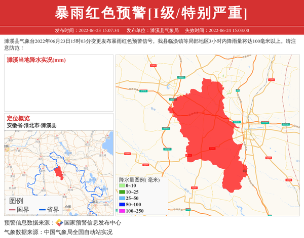 濉溪县气象台2022年06月23日15时03分变更发布暴雨红色预警信号。我县临涣镇等局部地区3小时内降雨量将达100毫米以上。请注意防范! 信息来源:国家预警信息发布中心; 发布单位:濉溪县气象局。