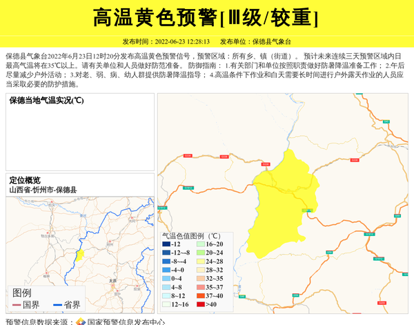 保德县气象台2022年6月23日12时20分发布高温黄色预警信号,预警区域:所有乡、镇(街道)。 预计未来连续三天预警区域内日最高气温将在35℃以上。请有关单位和人员做好防范准备。 防御指南: 1.有关部门和单位按照职责做好防暑降温准备工作; 2.午后尽量减少户外活动; 3.对老、弱、病、幼人群提供防暑降温指导; 4.高温条件下作业和白天需要长时间进行户外露天作业的人员应当采取必要的防护措施。 信息来源:国家预警信息发布中心; 发布单位:保德县气象台。