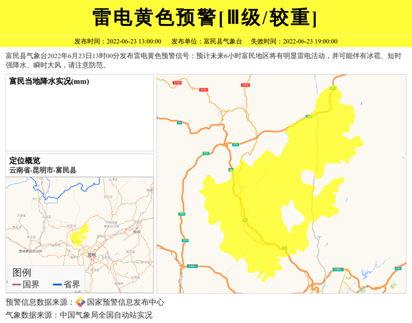 富民县气象台2022年6月23日13时00分发布雷电黄色预警信号:预计未来6小时富民地区将有明显雷电活动,并可能伴有冰雹、短时强降水、瞬时大风,请注意防范。 信息来源:国家预警信息发布中心; 发布单位:富民县气象台。