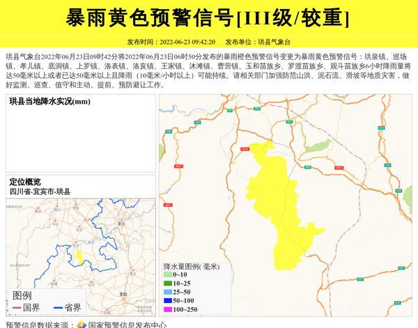 珙县气象台2022年06月23日09时42分将2022年06月23日06时50分发布的暴雨橙色预警信号变更为暴雨黄色预警信号:珙泉镇、巡场镇、孝儿镇、底洞镇、上罗镇、洛表镇、洛亥镇、王家镇、沐滩镇、曹营镇、玉和苗族乡、罗渡苗族乡、观斗苗族乡6小时降雨量将达50毫米以上或者已达50毫米以上且降雨(10毫米/小时以上)可能持续。请相关部门加强防范山洪、泥石流、滑坡等地质灾害,做好监测、巡查、值守和主动、提前、预防避让工作。 信息来源:国家预警信息发布中心; 发布单位:珙县气象台。