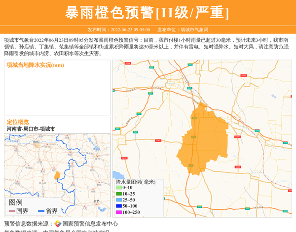 项城市气象台2022年06月23日09时05分发布暴雨橙色预警信号:目前,我市付楼1小时雨量已超过30毫米,预计未来3小时,我市南顿镇、孙店镇、丁集镇、范集镇等全部镇和街道累积降雨量将达50毫米以上,并伴有雷电、短时强降水、短时大风,请注意防范强降雨引发的城市内涝、农田积水等次生灾害。 信息来源:国家预警信息发布中心; 发布单位:项城市气象局。