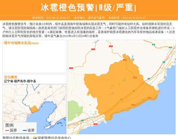 冰雹橙色预警信号:预计未来2小时内,绥中县及渤海中部海域将出现冰雹天气,同时可能伴有短时大风、短时强降水等强对流天气,请注意防范防御指南.1.政府及相关部门按照职责做好防冰雹的应急工作;2.气象部门做好人工防雹作业准备并择机进行作业;3.户外行人立即到安全的地方暂避;4.驱赶家禽、牲畜进入有顶蓬的场所,妥善保护易受冰雹袭击的汽车等室外物品或者设备;5.注意防御冰雹天气伴随的雷电灾害。绥中县气象台2022年6月23日20时1分发布 信息来源:国家预警信息发布中心; 发布单位:绥中县气象局。