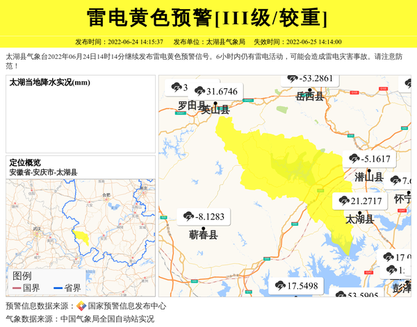 太湖县气象台2022年06月24日14时14分继续发布雷电黄色预警信号。6小时内仍有雷电活动,可能会造成雷电灾害事故。请注意防范! 信息来源:国家预警信息发布中心; 发布单位:太湖县气象局。