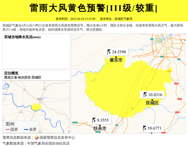 双城区气象台6月24日13时25分发布雷雨大风黄色预警信号:预计未来6小时,我区大部分乡镇、街道将有雷雨大风天气,最大阵风风力7-8级,局地可能伴有冰雹、短时强降水等强对流天气,请注意预防。 信息来源:国家预警信息发布中心; 发布单位:双城区气象局。