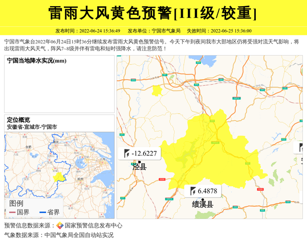 宁国市气象台2022年06月24日15时36分继续发布雷雨大风黄色预警信号。今天下午到夜间我市大部地区仍将受强对流天气影响,将出现雷雨大风天气,阵风7~8级并伴有雷电和短时强降水,请注意防范! 信息来源:国家预警信息发布中心; 发布单位:宁国市气象局。
