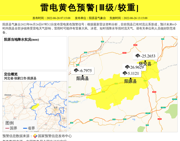 阳原县气象台2022年06月26日07时12分发布雷电黄色预警信号:根据最新雷达资料分析,目前我县已有对流云系形成,预计未来6小时内我县全部乡镇将受雷电天气影响,雷雨时可能伴有雷暴大风、冰雹、短时强降水等强对流天气。请有关单位和人员做好防范准备。 信息来源:国家预警信息发布中心; 发布单位:阳原县气象台。
