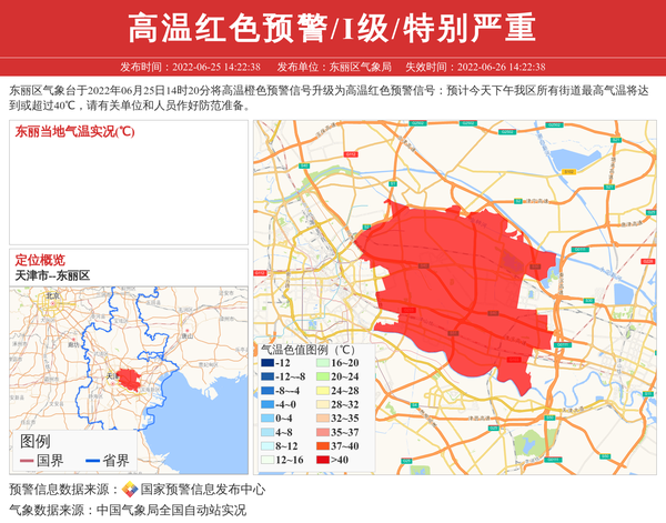 东丽区气象台于2022年06月25日14时20分将高温橙色预警信号升级为高温红色预警信号:预计今天下午我区所有街道最高气温将达到或超过40℃,请有关单位和人员作好防范准备。 信息来源:国家预警信息发布中心; 发布单位:东丽区气象局。