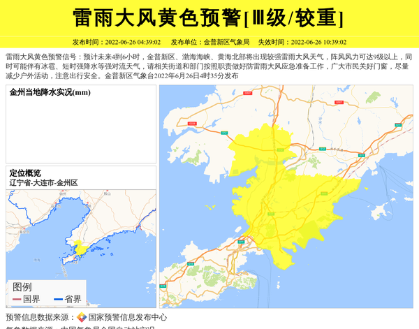 雷雨大风黄色预警信号:预计未来4到6小时,金普新区、渤海海峡、黄海北部将出现较强雷雨大风天气,阵风风力可达9级以上,同时可能伴有冰雹、短时强降水等强对流天气,请相关街道和部门按照职责做好防雷雨大风应急准备工作,广大市民关好门窗,尽量减少户外活动,注意出行安全。金普新区气象台2022年6月26日4时35分发布 信息来源:国家预警信息发布中心; 发布单位:金普新区气象局。