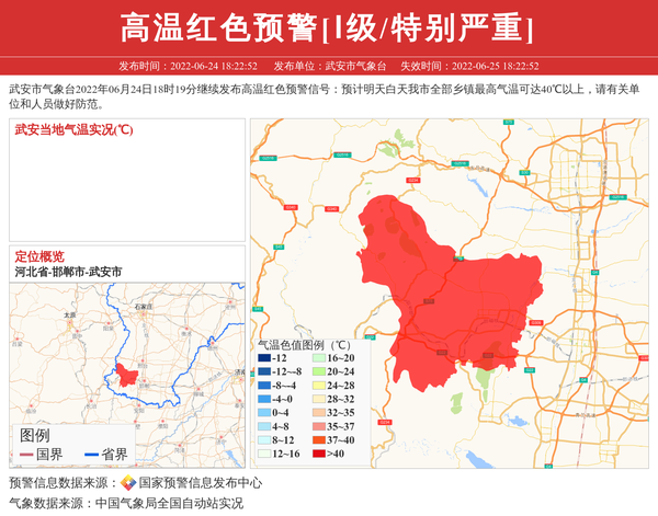 武安市气象台2022年06月24日18时19分继续发布高温红色预警信号:预计明天白天我市全部乡镇最高气温可达40℃以上,请有关单位和人员做好防范。 信息来源:国家预警信息发布中心; 发布单位:武安市气象台。