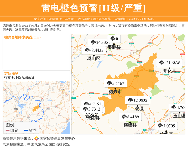 德兴市气象台2022年06月24日16时29分变更雷电橙色预警信号:预计未来2小时内,我市有较强雷电活动,局地伴有短时强降水、雷雨大风、冰雹等强对流天气,请注意防范。 信息来源:国家预警信息发布中心; 发布单位:德兴市气象局。
