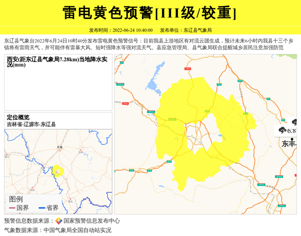 东辽县气象台2022年6月24日10时40分发布雷电黄色预警信号:目前我县上游地区有对流云团生成,预计未来6小时内我县十三个乡镇将有雷雨天气,并可能伴有雷暴大风、短时强降水等强对流天气。县应急管理局、县气象局联合提醒城乡居民注意加强防范 信息来源:国家预警信息发布中心; 发布单位:东辽县气象局。
