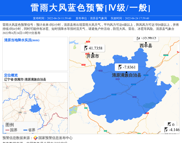 雷雨大风蓝色预警信号:预计未来1到2小时,清原县将出现雷雨大风天气,平均风力可达6级以上,阵风风力可达7到8级以上,并将持续3到4小时,同时可能伴有冰雹、短时强降水等强对流天气,请避免户外活动,防范大风、雷击、冰雹等风险。清原县气象台2022年6月24日11时55分发布 信息来源:国家预警信息发布中心; 发布单位:清原县气象局。