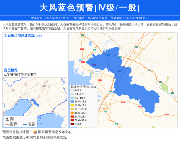 大风蓝色预警信号:预计24日白天到夜间,大石桥市偏西风转西南风4到5级、阵风7级,请做好防大风工作,妥善安置室外物品,刮风时不要在广告牌、临时搭建物等下面逗留。大石桥市气象台2022年6月24日7时29分发布 信息来源:国家预警信息发布中心; 发布单位:大石桥市气象局。