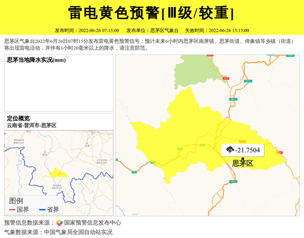 思茅区气象台2022年6月26日07时15分发布雷电黄色预警信号:预计未来6小时内思茅区南屏镇、思茅街道、倚象镇等乡镇(街道)将出现雷电活动,并伴有1小时20毫米以上的降水,请注意防范。 信息来源:国家预警信息发布中心; 发布单位:思茅区气象台。