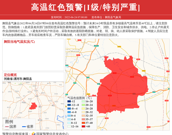 舞阳县气象台2022年06月24日07时00分发布高温红色预警信号:预计未来24小时我县所有乡镇最高气温将升至40℃以上,请注意防范。防御指南:1.政府及相关部门按照职责采取防暑降温应急措施,保障生产、消防、卫生安全和城市供水、供电。2.停止户外露天作业(除特殊行业外)。3.避免长时间户外活动,采取有效的遮阳防晒措施,对老、弱、病、幼人群采取保护措施。4.驾驶人员应注意车内勿放易燃物品,开车前应检查车况,严防车辆自燃。5.有关部门和单位要特别注意防火。 信息来源:国家预警信息发布中心; 发布单位:舞阳县气象局。