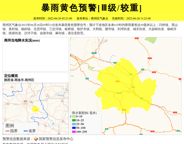 商州区气象台2022年06月26日05时21分发布暴雨黄色预警信号:预计下述地区未来6小时内降雨量将达50毫米以上:闫村镇、黑山镇、夜村镇、杨斜镇、北宽坪镇、三岔河镇、板桥镇、牧护关镇、大荆镇、腰市镇、刘湾街道、城关街道、大赵峪街道、杨峪河镇、陈塬街道、沙河子镇、金陵寺镇、麻街镇,请注意防范。 信息来源:国家预警信息发布中心; 发布单位:商州区气象台。