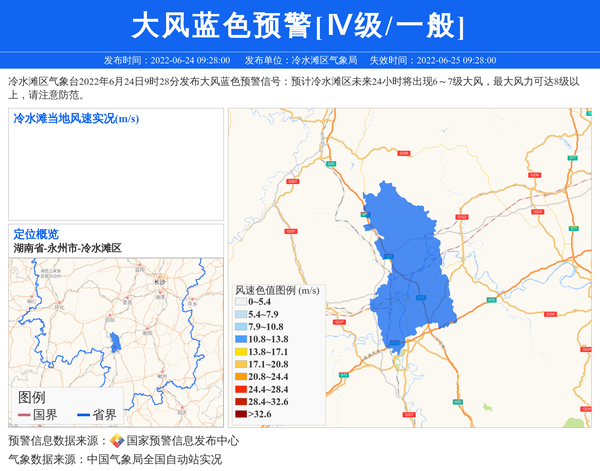 冷水滩区气象台2022年6月24日9时28分发布大风蓝色预警信号:预计冷水滩区未来24小时将出现6~7级大风,最大风力可达8级以上,请注意防范。 信息来源:国家预警信息发布中心; 发布单位:冷水滩区气象局。