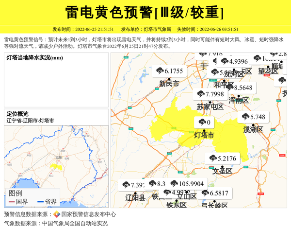 雷电黄色预警信号:预计未来1到3小时,灯塔市将出现雷电天气,并将持续2到3小时,同时可能伴有短时大风、冰雹、短时强降水等强对流天气,请减少户外活动。灯塔市气象台2022年6月25日21时47分发布。 信息来源:国家预警信息发布中心; 发布单位:灯塔市气象局。