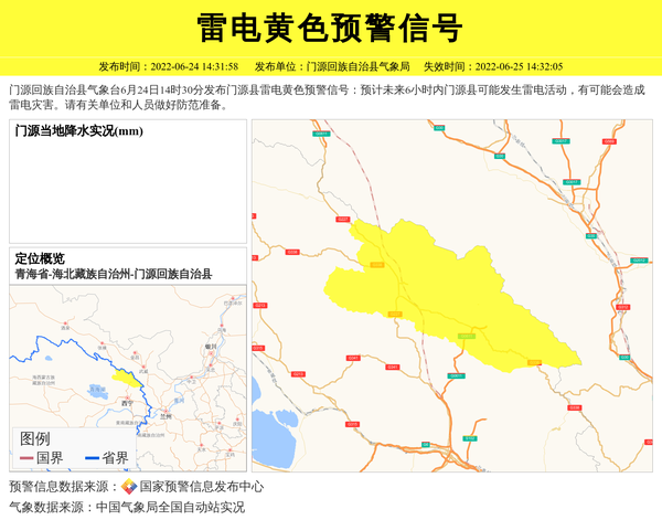 门源回族自治县气象台6月24日14时30分发布门源县雷电黄色预警信号:预计未来6小时内门源县可能发生雷电活动,有可能会造成雷电灾害。请有关单位和人员做好防范准备。 信息来源:国家预警信息发布中心; 发布单位:门源回族自治县气象局。