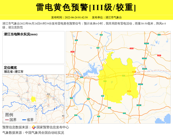 潜江市气象台2022年06月24日01时39分发布雷电黄色预警信号:预计未来6小时,我市局部有雷电活动,雨量30-50毫米,阵风6-8级,请注意防范 信息来源:国家预警信息发布中心; 发布单位:潜江市气象台。