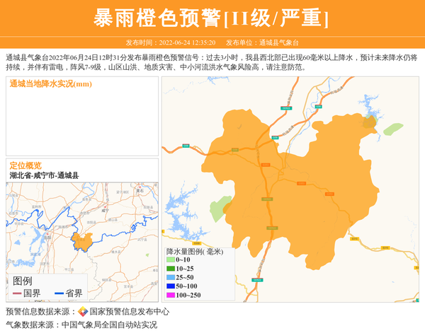 通城县气象台2022年06月24日12时31分发布暴雨橙色预警信号:过去3小时,我县西北部已出现60毫米以上降水,预计未来降水仍将持续,并伴有雷电,阵风7-9级,山区山洪、地质灾害、中小河流洪水气象风险高,请注意防范。 信息来源:国家预警信息发布中心; 发布单位:通城县气象台。