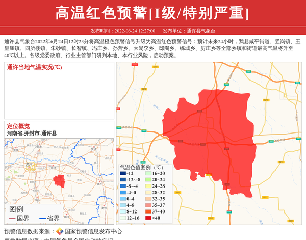 通许县气象台2022年6月24日12时23分将高温橙色预警信号升级为高温红色预警信号:预计未来24小时,我县咸平街道、竖岗镇、玉皇庙镇、四所楼镇、朱砂镇、长智镇、冯庄乡、孙营乡、大岗李乡、邸阁乡、练城乡、厉庄乡等全部乡镇和街道最高气温将升至40℃以上。各级党委政府、行业主管部门研判本地、本行业风险,启动预案。 信息来源:国家预警信息发布中心; 发布单位:通许县气象台。
