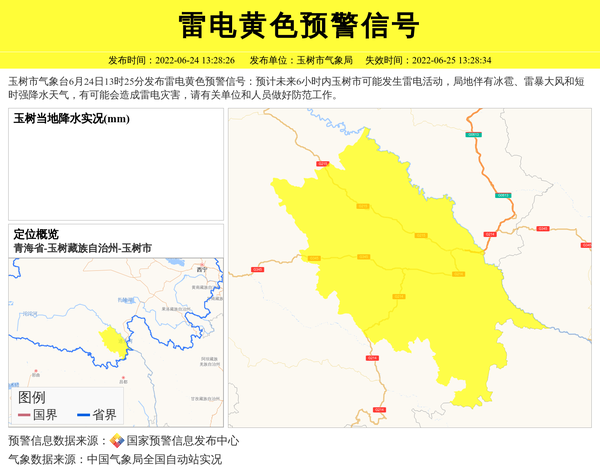 玉树市气象台6月24日13时25分发布雷电黄色预警信号:预计未来6小时内玉树市可能发生雷电活动,局地伴有冰雹、雷暴大风和短时强降水天气,有可能会造成雷电灾害,请有关单位和人员做好防范工作。 信息来源:国家预警信息发布中心; 发布单位:玉树市气象局。