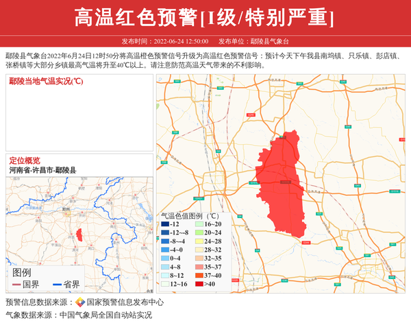 鄢陵县气象台2022年6月24日12时50分将高温橙色预警信号升级为高温红色预警信号:预计今天下午我县南坞镇、只乐镇、彭店镇、张桥镇等大部分乡镇最高气温将升至40℃以上。请注意防范高温天气带来的不利影响。 信息来源:国家预警信息发布中心; 发布单位:鄢陵县气象台。