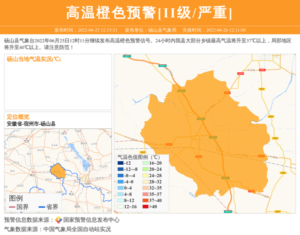 砀山县气象台2022年06月25日12时11分继续发布高温橙色预警信号。24小时内我县大部分乡镇最高气温将升至37℃以上,局部地区将升至40℃以上。请注意防范! 信息来源:国家预警信息发布中心; 发布单位:砀山县气象局。