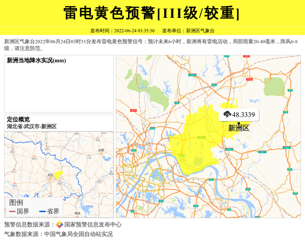 新洲区气象台2022年06月24日03时31分发布雷电黄色预警信号:预计未来6小时,新洲将有雷电活动,局部雨量20-40毫米,阵风6-8级,请注意防范。 信息来源:国家预警信息发布中心; 发布单位:新洲区气象台。